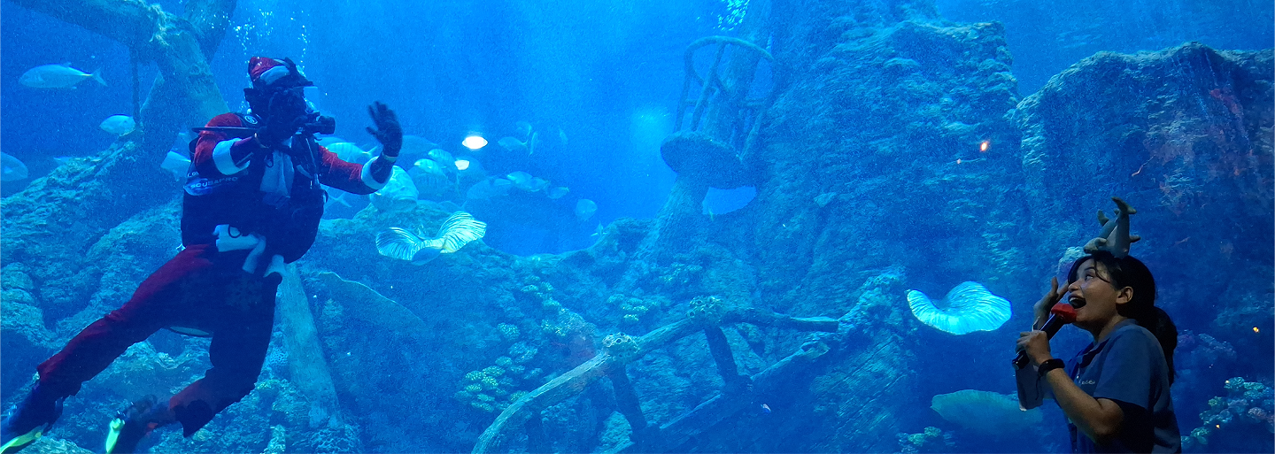 Ciptakan momen liburan tak terlupakan di bawah laut! Saksikan Santa berbagi kebahagiaan dan semangat Natal di antara ikan-ikan yang memukau.